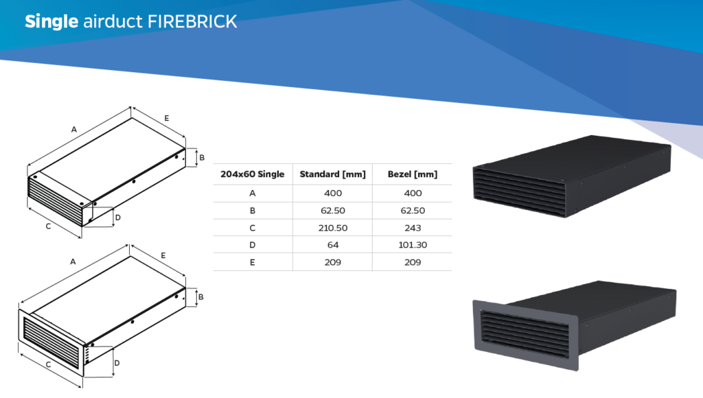 Designed for peak performance and functionality,  the airduct FIREBRICK sets the standard with 400mm long transitions (204x60mm, 220x90mm) for single and double airbricks. It includes an optional bezel, and site-measured transitions can be available on request. The airduct FIREBRICK is engineered with a A1 rated steel and is specifically designed to ensure compliance for mechanical ventilation systems in dwellings over 18m (11m in Scotland).