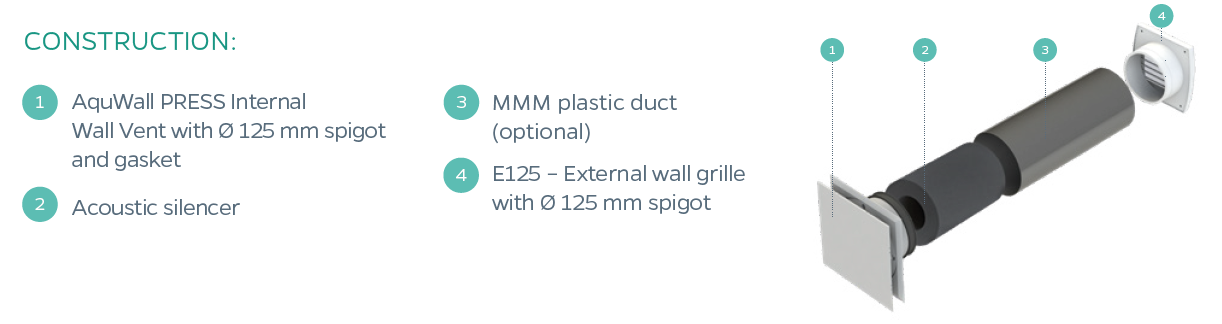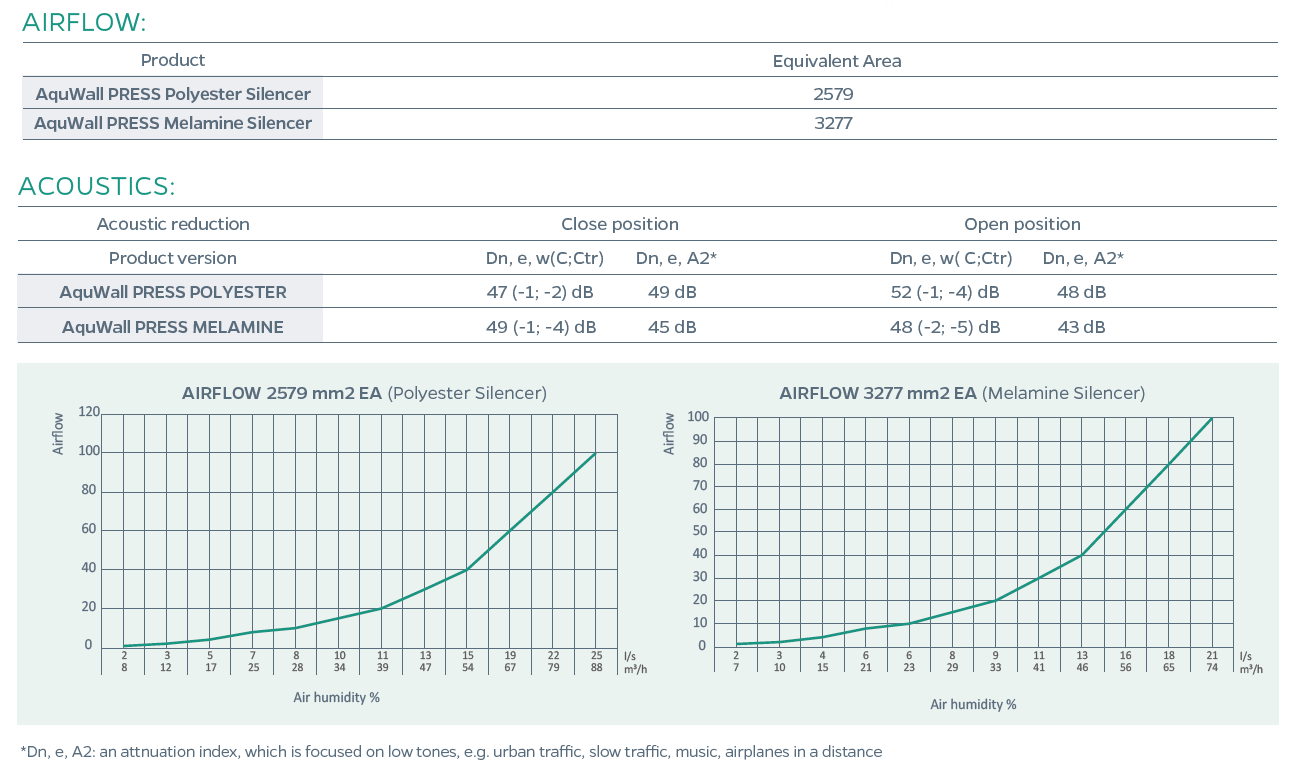 Acoustic duct mounted silencers are available to reduce noise ingress from outside and provide a more comfortable indoor environment. The Aquwall Press silencers are available in both melamine and polyester to suit the equivalent area requirements. Both options provide an equivalent area in excess of 2,500mm2 to ensure full compliance with TGD Part F.