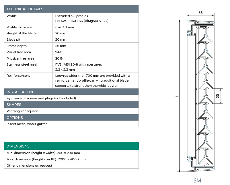 BRL20V-SM is a Surface Mounted Louvre with 20 V-blade. It is made of extruded alu profiles – EN AW-6060 T66 (AlMgSi0.5 F22) and stainless steel mesh – RVS (AISI 304) with apertures 2.3 x 2.3 mm. Its visual free area is 94% and physical free area is 30%.
