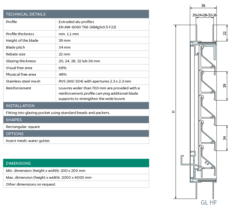BRL65Z-FL is a Standard Ventilation Wall Louvre with flange with 65 Z-blade. It is made of extruded alu profiles – EN AW-6060 T66 (AlMgSi0.5 F22) and stainless steel mesh – RVS (AISI 304) with apertures 2.3 x 2.3 mm. Its visual free area is 78% and physical free area is 53%.