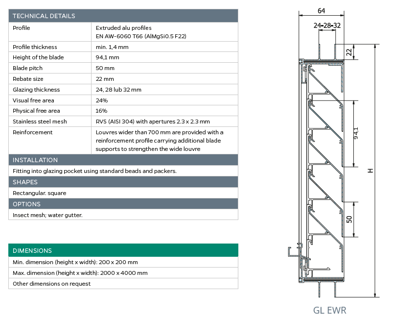 BRL60Z-GL is a Standard Ventilation Glazed-in Louvre with 60 Z-blade. It is made of extruded alu profiles – EN AW-6060 T66 (AlMgSi0.5 F22) and stainless steel mesh – RVS (AISI 304) with apertures 2.3 x 2.3 mm. Its visual free area is 90% and physical free area is 76%.